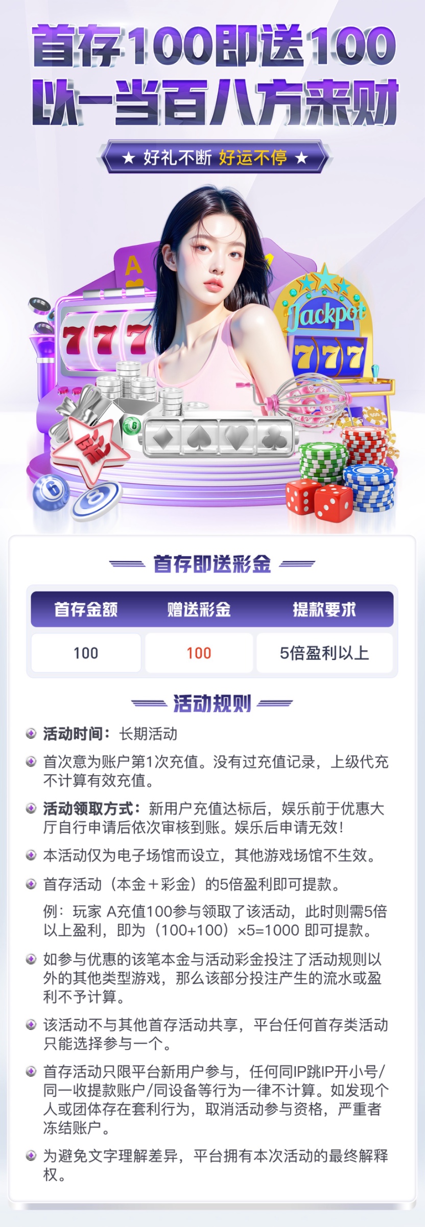 首存100+38、 首存500+58 首存1000+88、 首存3000+188、 首存5000+288 首存活动只限新用户参与,充值+彩金一倍流水即可出款 (首存本+彩的1倍流水;只计算电子、棋牌、捕鱼)